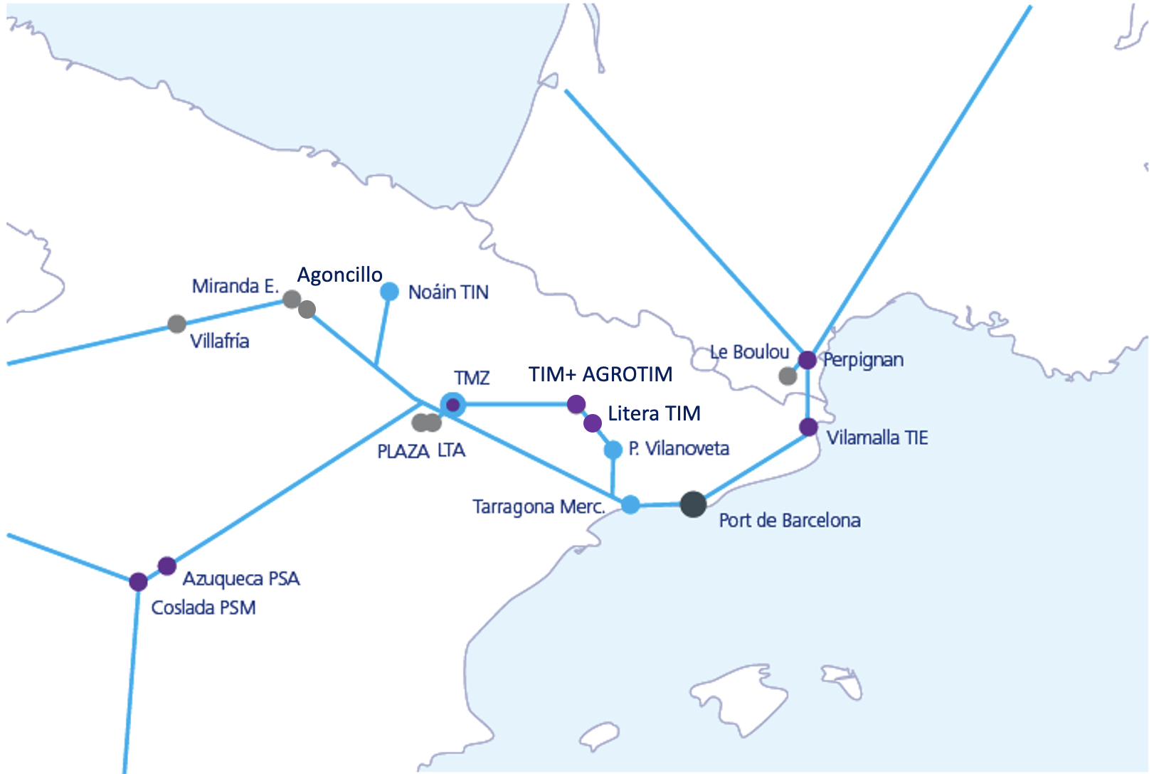 The Port of Barcelona network is made up of inland terminals and intermodal services between them and the port infrastructure. By promoting intermodality through short-distance rail and maritime services, and with the support of inland maritime terminals, the Port of Barcelona contributes to creating more efficient, competitive and environmentally sustainable logistics chains. The Barcelona Port Authority participates directly in the management of 8 intermodal terminals: tmZ, PSA Azuqueca, PSM Coslada, Perpignan, Vilamalla, TIM and AgroTIM Monzón, and LiteraTIM to bring port and maritime services closer to its clients.