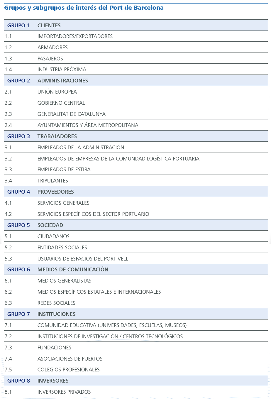 El Port de Barcelona ha identificado un total de 8 grupos de interés y 26 subgrupos de interés. Estos son los colectivos, actividades y organizaciones a quienes quiere y debe responder expectativas y demandas. Desde la perspectiva de la Autoridad Portuaria de Barcelona, además, hay que considerar un grupo de interés prioritario y específico: las empresas concesionarias, que son gestoras de terminales e instalaciones en los terrenos portuarios.